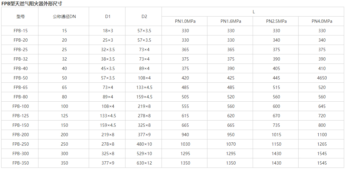 FPB天然氣阻火器參數(shù)及范圍